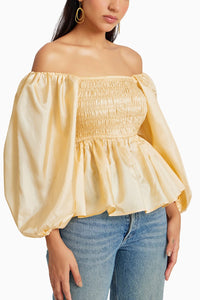 Featuring Frankie Champagne Top by Malie. This top has an elasticated design across the chest and back, with gathers at the cutline that create a frill at the bottom. It drapes loosely over the stomach and showcases elasticated detailing at the sleeve cuffs for a balloon-sleeve effect. Crafted from satin polyester, it is mid-hip length.