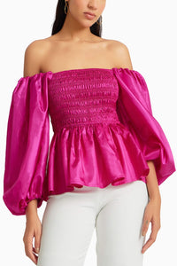 Featuring Frankie Fuchsia Pink Top by Malie. This top has an elasticated design across the chest and back, with gathers at the cutline that create a frill at the bottom. It drapes loosely over the stomach and showcases elasticated detailing at the sleeve cuffs for a balloon-sleeve effect. Crafted from satin polyester, it is mid-hip length.