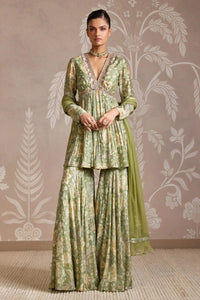 Featuring Fray Mint Print Couture Garara Set by Ridhi Mehra's In the Folds Summer Collection '25. This sophisticated set includes a placement embroidered printed fine silk short Anarkali, paired with a matching garara and a net dupatta adorned with a four-sided printed border. The mint print adds a refreshing, contemporary touch to this timeless ensemble.