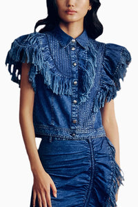 So fun and adorned with fringe, this button-down washed denim shirt features ruffles and pintuck detailing. It is tailored for relaxed fit which traces your silhouette.