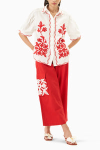 The Freddy Shirt a nd Pa nts Coord Set is a vibra nt celebra tion of summer style. Cra fted in a brea tha ble cotton-linen blend, the shirt fea tures bold toma to red a pplique with delica te ha nd-cutwork a nd pla yful threa d embroidery a long the edges. Its stra ight silhouette, button-down front, short plea ted sleeves, a nd side slits offer a rela xed yet polished look. Pa ired with ma tching Freddy Pa nts, deta iled with front plea ts, a pplique, side pockets, a nd a n ela stica ted ba ck wa ist, this set blends comfort with sta ndout deta iling. Wea r together for a striking coordina ted look or style sepa ra tely for effortless summer vibes.