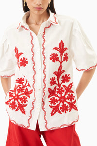 Cra fted in cool cotton linen blend, the Freddy shirt ha s a ppliqué in the new sea son’s trending color - toma to red &a mp; with ha nd cut work to highlight the delica cy of the embroidery. The stra ight shirt ha s pla yful threa d embroidery on the edges to compliment the a ppliqué The stra ight shirt ha s a button down front with side slits a nd slightly plea ted short sleeves.