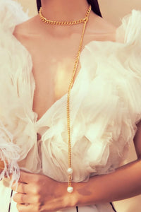 This elegant jewelry piece features a Free Fall Chain with natural pearls, set in hypoallergenic brass and plated with 22k gold. The classic white color adds timeless beauty to the design. Perfect for any occasion!