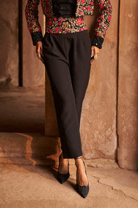 Featuring the Free Spirit High-Waisted Pants by The House of Exotique. These ankle-length pants feature a broad waistband adorned with thread and crystal work, slant pockets, and elegant center pleats. Elevate your style with this sophisticated and versatile piece.