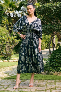 A deep-sea daydream — this flowy black dress shimmers with hand-embroidered corals and starfish, made for sun-dappled strolls and twilight escapes.