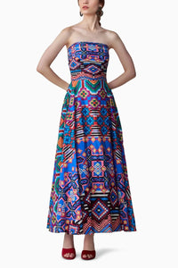 Frenchy Ikat Print Strapless Flared Dress with Pleated Bustier