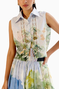 Introducing the Freya Set that is a perfect blend of elegance and versatility. This shirt-and-skirt set comes in three stunning variations: Landscape and Flora, both featuring vertical lace inserts and vibrant placement prints on breathable linen lyocell, and a classic Schiffli Embroidery design on soft viscose linen. Each sleeveless shirt is thoughtfully designed with criss-cross dori detailing at the front, adding a playful yet refined touch.