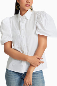 Featuring Freya Snow White Shirts by Malie. This solid shirt is adorned with short puff sleeves, a button placket, and a pocket. Crafted entirely from 100% sustainable cotton, it combines style with eco-conscious materials.
