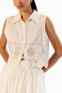 Introducing the Freya Set that is a perfect blend of elegance and versatility. This shirt-and-skirt set comes in three stunning variations: Landscape and Flora, both featuring vertical lace inserts and vibrant placement prints on breathable linen lyocell, and a classic Schiffli Embroidery design on soft viscose linen. Each sleeveless shirt is thoughtfully designed with criss-cross dori detailing at the front, adding a playful yet refined touch.