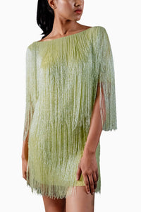 Featuring a glimmering mini dress crafted from tulle base fabric, this piece stands out with hand-curated fringes that create a dazzling, textured effect. The dress is designed with a stunning backless style, offering a bold and elegant silhouette. The interplay of shimmering fringes and the chic backless cut ensures this mini dress is perfect for making a glamorous and memorable entrance.