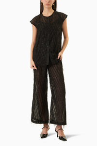 This black georgette fringe set exudes chic elegance, with flowing fabric and eye-catching fringe details that add movement and texture. Perfect for a bold, stylish statement at any event.