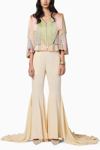 Featuring a handcrafted statement cape made with a silk base and multi-colored fringes cascading from the shoulder to the waist, this ensemble by 431-88 blends comfort with flair. The Fringe Mint Cape is structured with padded shoulders for a sharp silhouette and fits snugly, with the fringes adding dynamic movement. Paired with the Sharara Peach Pants, crafted in luxurious crepe with a flowing trail and practical side pockets, this co-ord set is the perfect mix of drama and elegance for any festive affair.