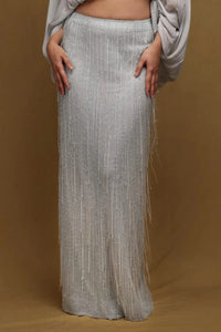 This straight skirt is made from a soft tulle base, adorned with intricate beaded lines that add a touch of elegance. The multi-colored fringe highlights give it a playful, vibrant edge, making it a standout piece for any occasion. The combination of delicate tulle and bold embellishments creates a perfect balance of texture and style.