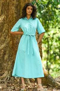 Featuring an A-line silhouette, this midi dress is designed with a front tie and flattering high waist cut-outs. A classic shirt collar, front placket, and relaxed fit half sleeves add effortless charm, while side pockets offer practical ease.