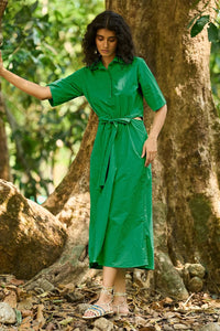 Featuring a flattering A-line silhouette, this midi dress is designed with a front tie and high waist cut-outs for a modern twist. It includes a classic shirt collar, front placket, and relaxed fit half sleeves, complete with functional side pockets for everyday ease.
