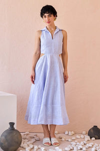 In a delicate soft halogen blue, this ballerina-length dress balances structure with subtle shimmer. Thoughtfully panelled and dusted with mirror work, it brings quiet elegance to modern design. The look is defined by a crisp collared neckline, sleeveless cut, and cut-out details at both sides of the waist—creating an airy, flattering silhouette. A smocked back adds comfort, while a concealed zipper at the center back hip ensures a seamless finish. Effortless and light, this dress is ideal for both everyday moments and special occasions.