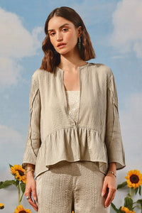 Featuring the Frosted Chrome Pintuck Peplum Jacket by 29 India's Sunehri collection. Made from organic cotton, this jacket showcases intricate pintuck detailing with A-line sleeves, expertly handcrafted for a flattering silhouette that blends classic charm with contemporary elegance.