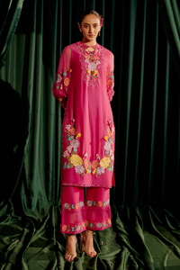 Introducing our vibrant fuchsia Chanderi kurta, adorned with intricate floral threadwork, beadwork, and stunning 3D appliqué. This eye-catching piece is paired with matching pants featuring elegant organza details, creating a harmonious and chic ensemble. To complete the look, a matching silk organza dupatta adds an extra layer of sophistication. Perfect for festive occasions or celebrations, this outfit combines traditional craftsmanship with contemporary flair.
