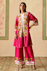 Featuring a fuchsia and ivory chanderi panelled short kurta embellished with chain-stitch threadwork and beadwork, paired with flared pants in matching hues adorned with intricate threadwork.