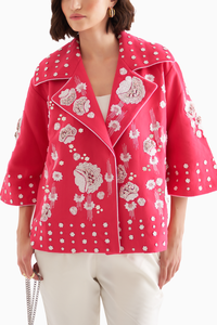 Introducing the Emily Banana Crepe Fuchsia Embroidered Jacket, a stunning statement piece crafted from luxurious banana crepe. This oversized jacket features exquisite hand embroidery and a bold statement collar, complemented by 3/4 A-line sleeves and contrast piping detailing. With its relaxed fit, we recommend sizing down for a more tailored look. Elevate your outfit with this vibrant and stylish jacket!