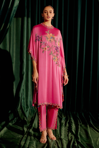 Fuchsia Floral Beadwork Kaftan with Slit Detail Pant