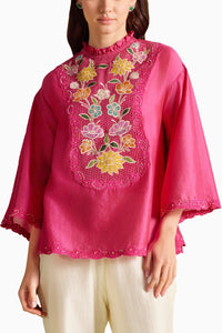 Featuring fuchsia chanderi applique and threadwork mesh detail yoke top.
