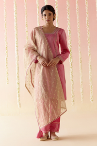 Fabric- Kurta: Crushed Tissue, Pant: Chanderi, Dupatta: Crushed Dobby Tissue Color- Fuchsia Rose Components- 3 Product Code- SVENEROGMKSD16