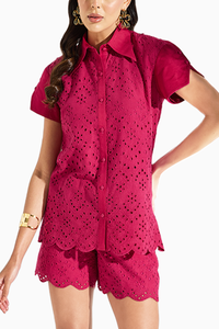 Featuring a schiffli cotton shirt with solid drooping shoulder sleeves, paired with straight elasticated shorts.
