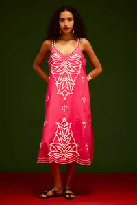Featuring a fuchsia strappy cotton dress with ivory flame thread embroidery, this relaxed-fit design is made from cotton poplin, combining vibrant energy with effortless comfort and style.