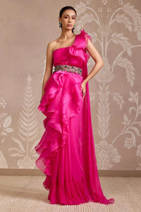 Featuring Fuchsia Twist Stardust Belted Sari Set by Ridhi Mehra's In the Folds Summer Collection '25. This stunning set includes a chiffon saree gown with chiffon and organza ruffles, paired with a jeweled belt that adds a touch of sparkle. A perfect fusion of elegance and contemporary charm in vibrant fuchsia.