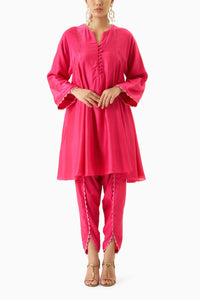 This bright fuchsia kurta set makes a great option for a festive occasion. Crafted in silk fabric is this short flared kurta paired with matching tulip pants. Scalloped detail at the sleeve cuff and pants overlapping hemline gives effortlessly blending look. You can style it with a pair of strappy heels and a clutch.