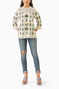 Structured and yet delicate. Beautifully crafted in premium crepe jaw dropping embroidery and lace detailed neckline makes this flattering blouse a heads turning statement.