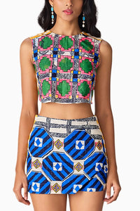 Featuring the Funky Geo Zelda Blouse by Saaksha & Kinni's Nirah Collection. This sleeveless, high-neck cropped blouse showcases a striking abstract print, blending modern sophistication with bold design for a statement-making look.