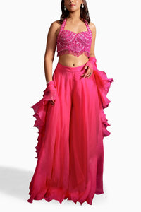 Featuring Fuchsia Daneen Embellished Lehenga Set in Organza, Net. Hand Embellished in Fuchsia Pink hues. Blouse is embroidered, Paired with divided lehenga. Styled with organza ruffle dupatta.