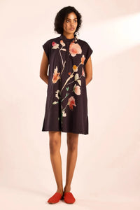 A timeless black short dress featuring a band neck, front placket, and a watercolor-inspired floral print. Crafted from airy cotton mul for effortless comfort, it comes with a discreet side-seam pocket for added ease.