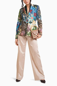 Featuring embroidered single-breasted blazer with peak lapels. Fully fused and lined for structure. Paired with high-waisted, wide-leg trousers.