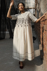 This chic and stylish dress features a quilted yoke that adds a unique, sophisticated touch to your wardrobe. Relaxed yet refined, it's perfect for everything from strolling down the street to making a statement at the office. The hand-screen printed design, black tape detailing, and MOP buttons bring a touch of everyday glamour to this dreamy piece. With quilted yoke and sleeves, a back zipper with keyhole opening, and a pocket, this dress oozes relaxed sophistication and is sure to become a wardrobe favorite.