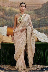 Ivory tissue saree paired with mirror work blouse on gota lined with chanderi silk , embellished with gota patti, ghungroos.