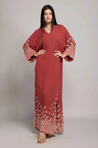Unveil your inner elegance with our Gajri Leaf Kaftan, a stunning blend of refined design and timeless beauty. The warm gajri hue complements delicate leaf patterns, creating a luxurious and graceful look. Its flowing silhouette offers comfort and sophistication for unforgettable style at any occasion.