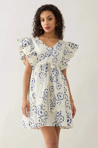 Featuring the bold Anther Print, the Gala Offwhite Dress is a favorite short dress with dramatic ruffled sleeves and a flattering V-neck with gathered details. A front tie-up enhances the silhouette, while pleats and topstitching add layered texture and elegant depth, making it perfect for evening events.