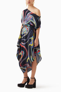 The Galaxy Draped Dress crafted from Studio Rigu's stunning vegan silk fabrication, trans-seasonal, is a statement piece. Made in our Stunning Galaxy Digital print uniquely hand made, this is a trend setting piece. Featuring a Free Size draped dress with an Embroidered Swarovski belt, this piece is versatile and can be styled in different ways. With a Relaxed and formal fit, it can be Paired with heels for a festive look.