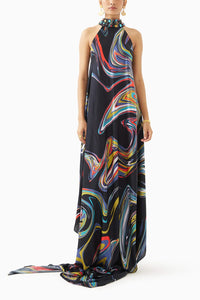 The Galaxy Halter Dress crafted from Studio Rigu's stunning vegan silk fabrication has Embroidered Swarovski Collar. Made in three in our stunning hand painted galaxy printed, this is a trend setting piece. Featuring halter sleeves, this piece is versatile and easy to wear. It is floor length and has an easy to wear fit. Pair it with heels for an elegant look.