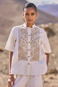 Ivory half sleeve shirt with Gara stitch inspired embroidery detaling at the front yoke. Band collar with contrast front button-down closure. Regular fit. Made in all weather suiting material.