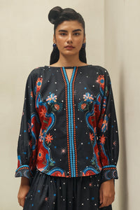 Featuring Garden Dancers Elle Top by NOIB's A/W'25 Collection. A cotton-satin top with placement printing, a round boat neckline with V keyhole and bead detailing, and asymmetrical cuffs, designed for versatile day-to-evening styling in the Garden of Dancers print.