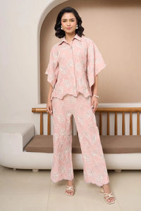 A delicate pink co-ord set featuring a relaxed-fit top with wide sleeves and matching wide-leg pants, both adorned with a subtle floral pattern. Perfect for a comfortable yet stylish look.