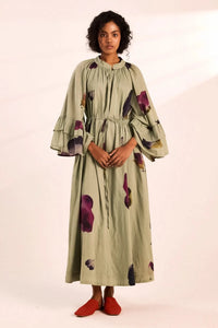 A long pale green dress with an artsy floral print, featuring pale green drawstrings at the waist and a band collar. It has bell sleeves and side seam pockets for a stylish and functional design.