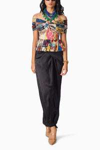 Featuring the Garden Quilt Chrysa Blouse with Black Zuri Skirt by Saaksha & Kinni's Nirah Collection. This set includes a bow-inspired drop-shoulder blouse with an abstract patchwork print, hand pleats, frill, and knot detailing, paired with a high-waisted asymmetric maxi wrap skirt featuring intricate pinch and fold detailing for a bold yet elegant look.