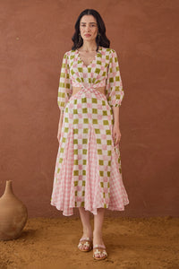 Breezy and ethereal, this midi dress is crafted from ultra-soft cotton mul mul, adorned with hand-blocked print in natures inspired hue of pink and green. This dress features a scalloped v neck, highlighted with peekaboo style cut on the waist and quarter length balloon sleeves add a touch of vintage romance, while the flared godet panels in skirt sways with every movement. Finished with a concealed zip in the centre back this dress is designed for dreamers and wanderers alike, this piece captures the essence of effortless boho elegance.