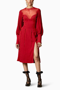 Featuring Garland Dress by QUOD. A scarlet colored midi dress in cheesecloth featuring panelled front with handmade red bead strings delicately attached along the pleats and the neckline.