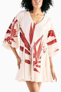 This off-white mini dress features a signature fern print, crafted from breathable cotton mul for a comfortable fit. It has puffed, elasticated sleeves that add a playful touch, while the V neckline enhances its feminine appeal. The dress is designed with godet flares at the hemline, creating a flattering, flowy silhouette. Perfect for a stylish yet relaxed look, this dress combines elegance and ease.